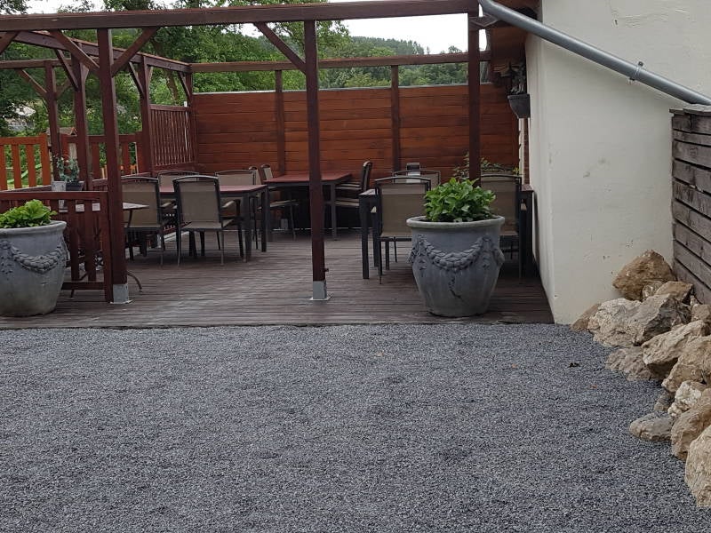 - 4 grote ronde tafels met 30 stoelen.